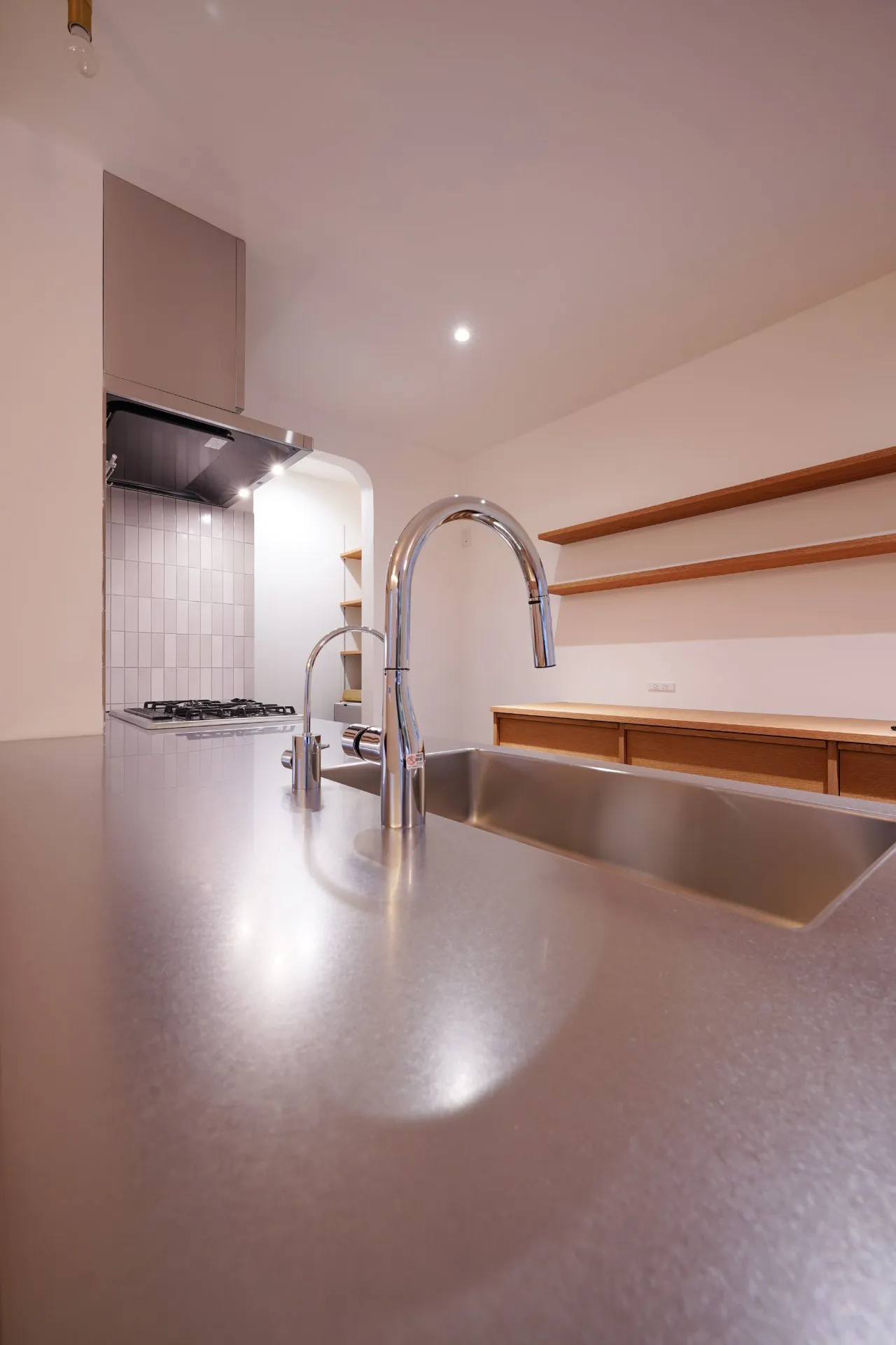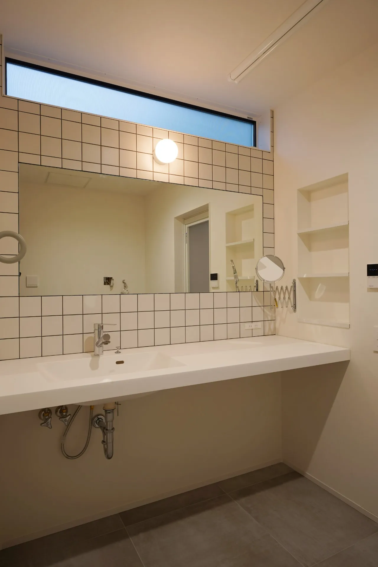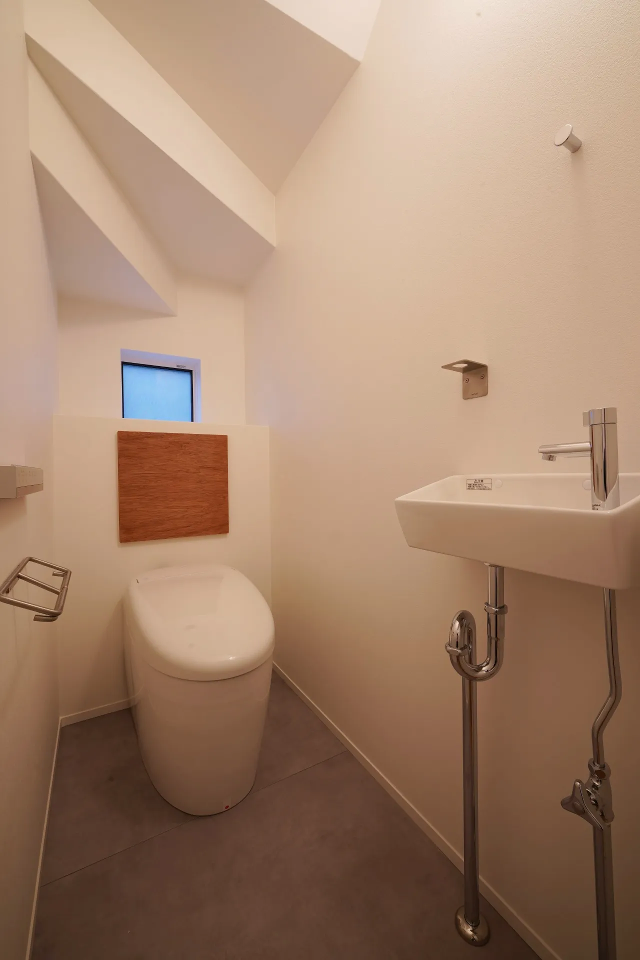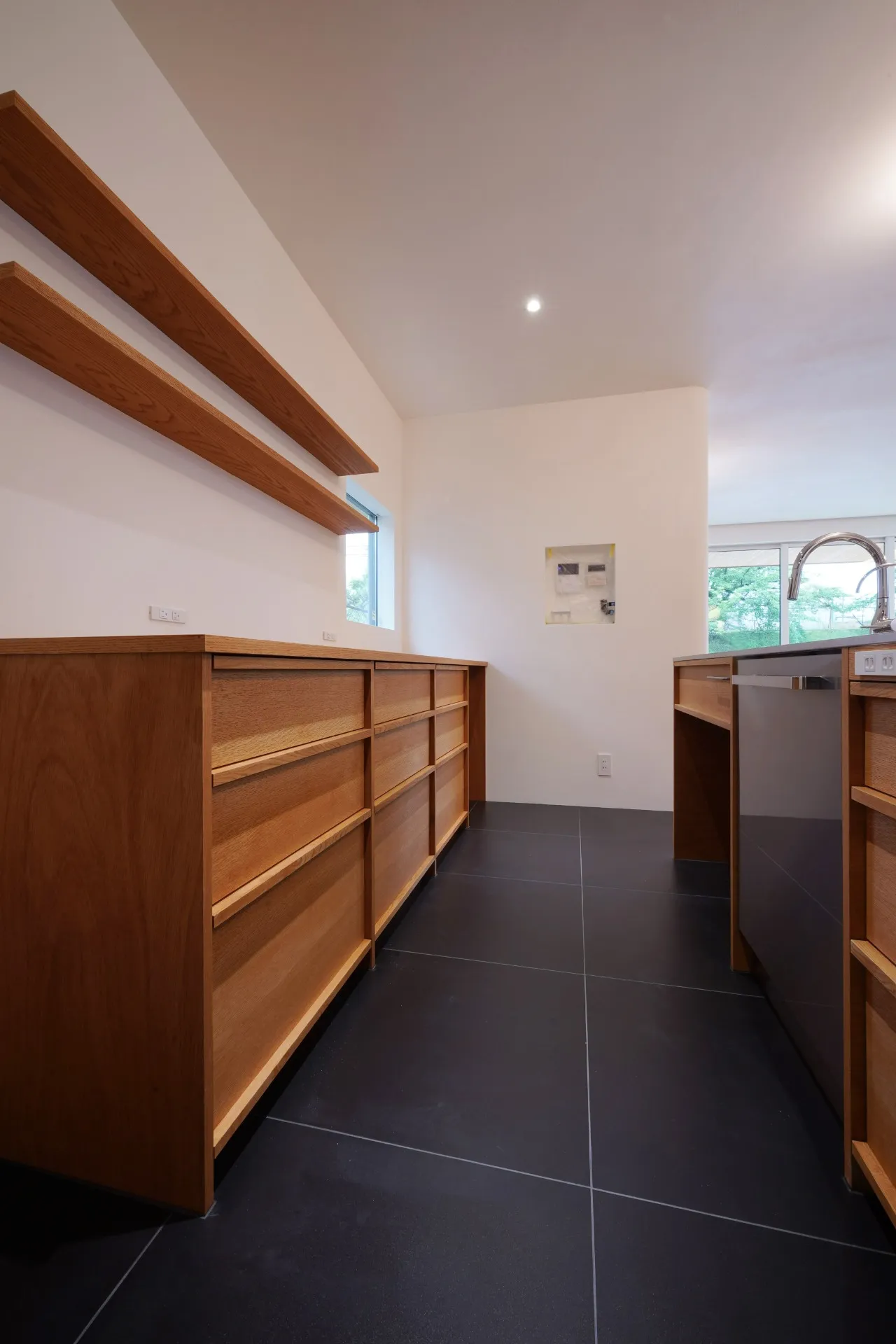 塗り壁と木を組み合わせた落ち着きのある外観に、深く伸びた軒が印象的な住まい。足元には、特注のパーケットフローリング。空間にさりげない表情を加え、シンプルながらも上質さを感じられるデザインに仕上がりました。素材感と余白がバランスよく共存し、少し懐かしくて、どこか新しいそんな心地よさを大切にした住まいです。