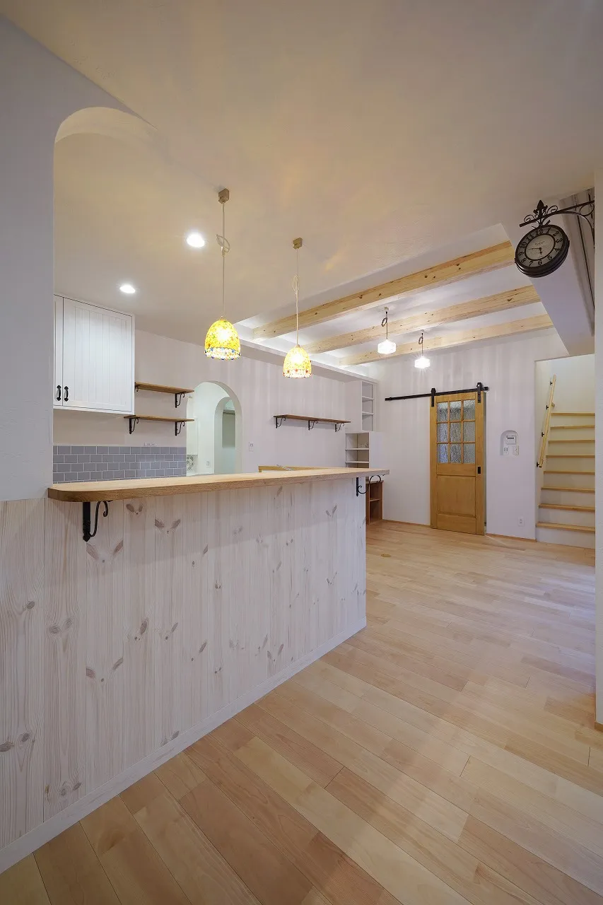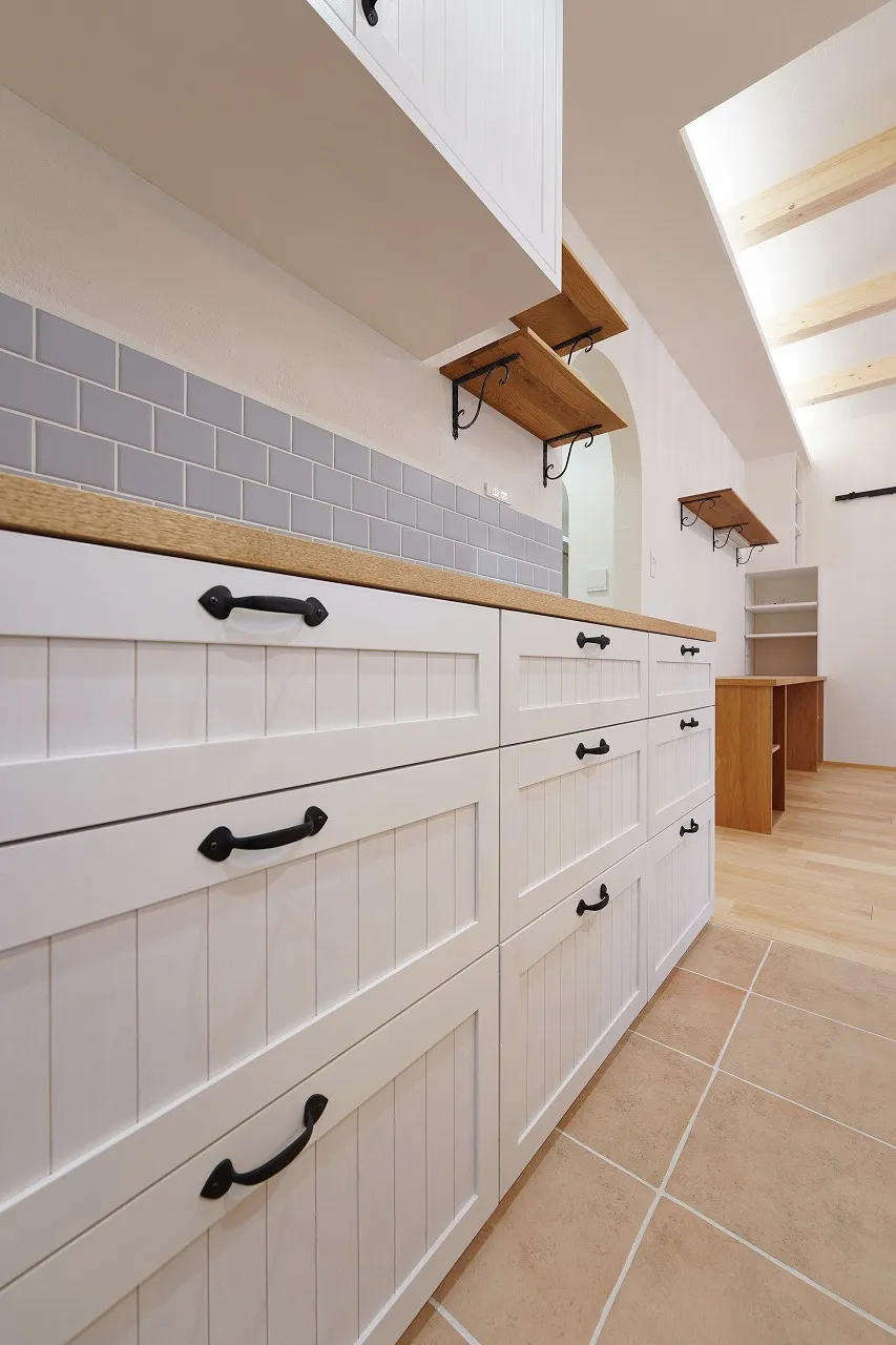 自然の力を取り込みつつも、性能にもとことんこだわった、光の明るさがとても似合うお家です。白を基調とした清潔感と可愛らしさのある空間の中に、無垢の木の温かさと黒アイアンをところどころに施し、可愛すぎずすっきりとしたフレンチカントリー調に仕上げました。外観も外壁の白さと、青い空のコントラストが良く似合う、存在感のある素敵なお家になっています。