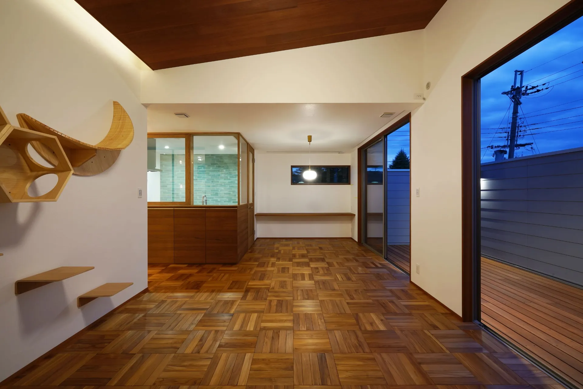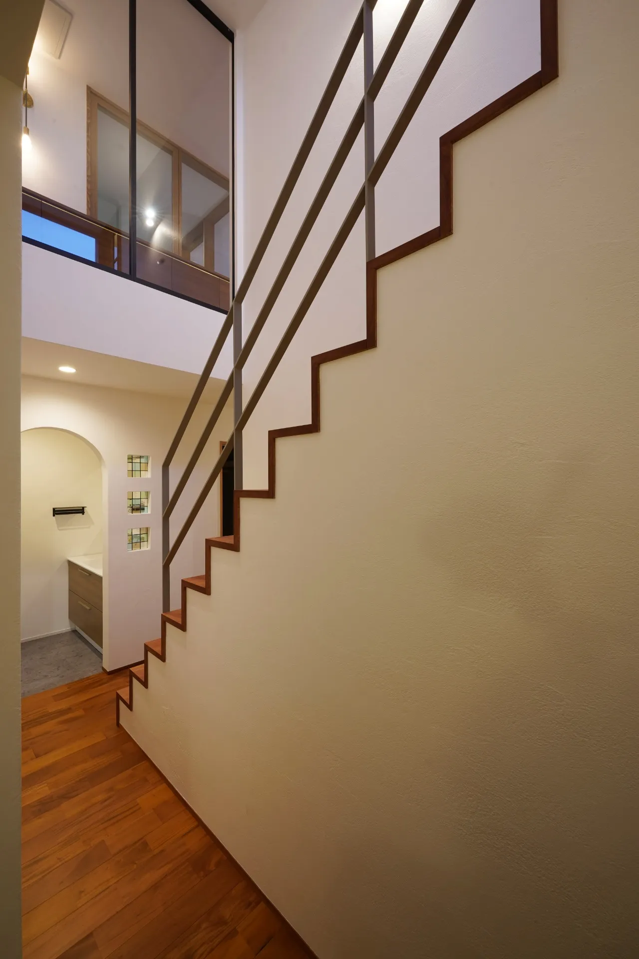 北欧ヴィンテージの世界観×お客さんこだわりの遊び心の融合によってオリジナル感のあるお家がまたひとつできました。2階リビングダイニングの無垢チークのパーケット床には、どんな樹種の床材にもできない華やかなインテリアの世界観を映す力強さがあります。玄関から吹抜けへと真っ直ぐ昇っていく階段もまた印象的な存在であり、その階段の手摺はお客さん自作のアイアン手摺ということも、このお家のハイライトのひとつです。