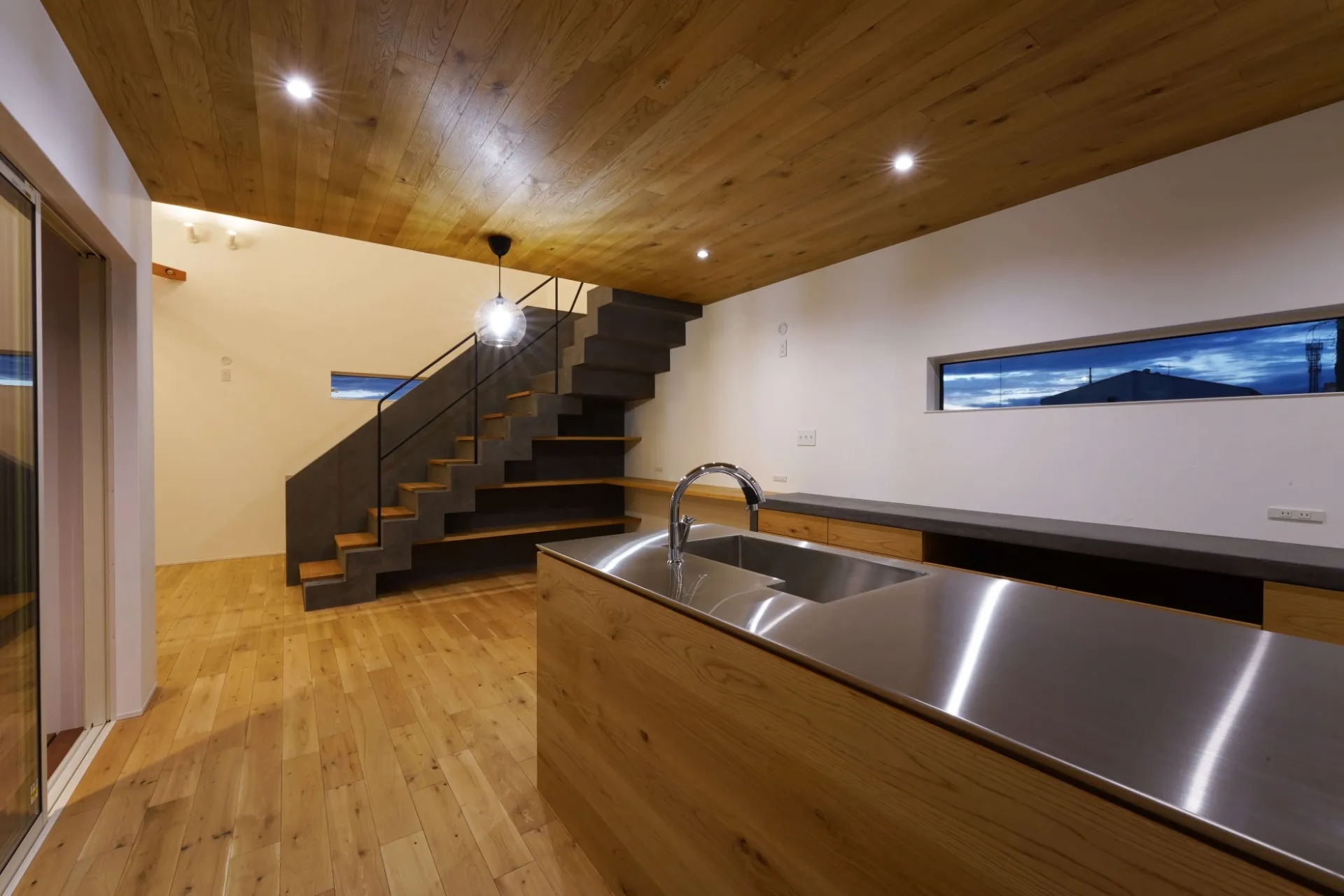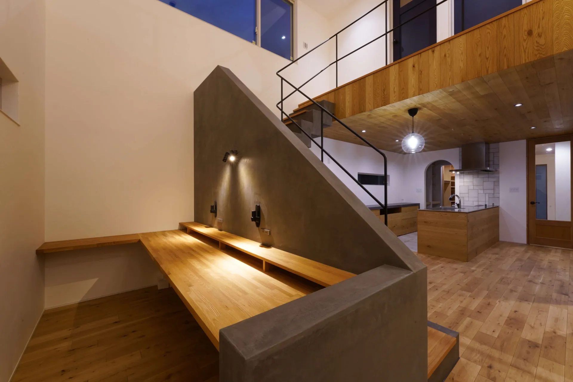 グレーのモールテックスの階段が圧倒的なお家。大きな中庭はプライバシーを確保したプライベートな空間。