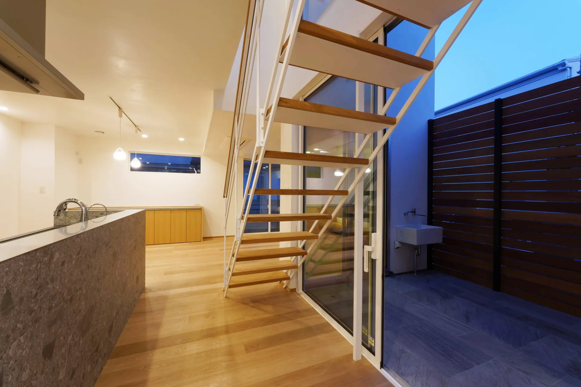 繊細なデザインの白いアイアン階段と中庭。 タイルデッキってやっぱり素敵ですね。