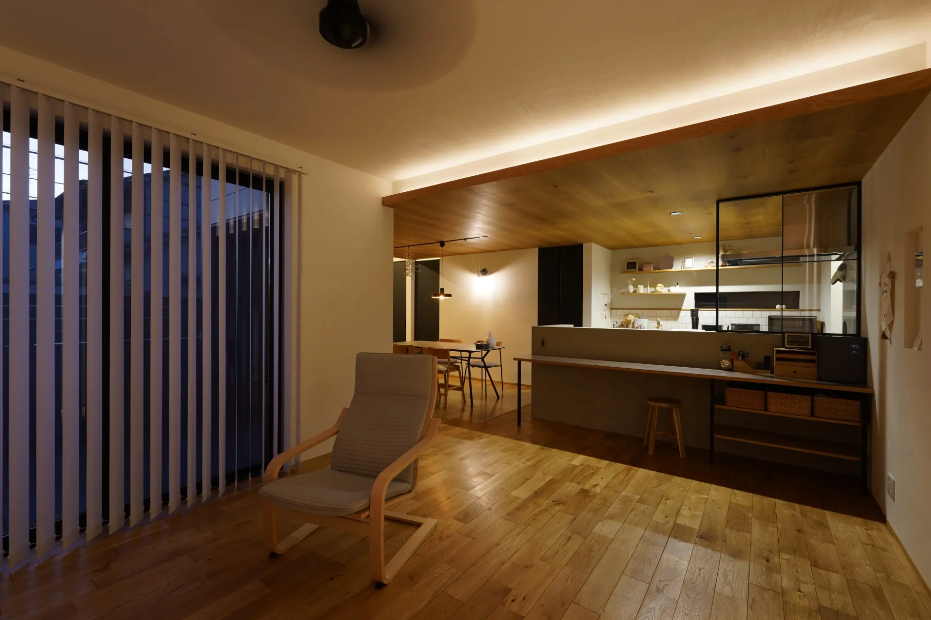 照明が映えるLDK。 昼とはまた違う表情を見せてくれます。