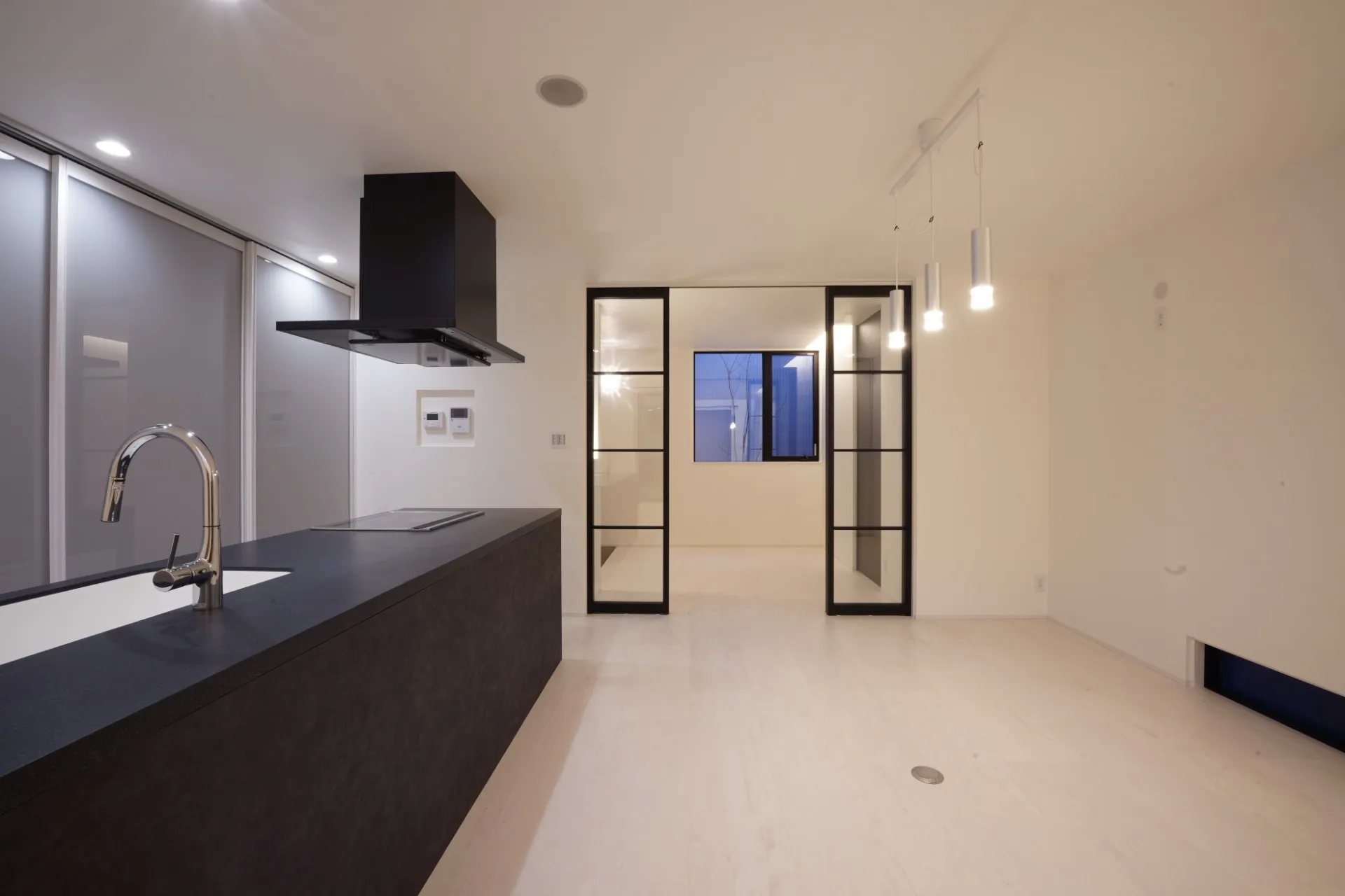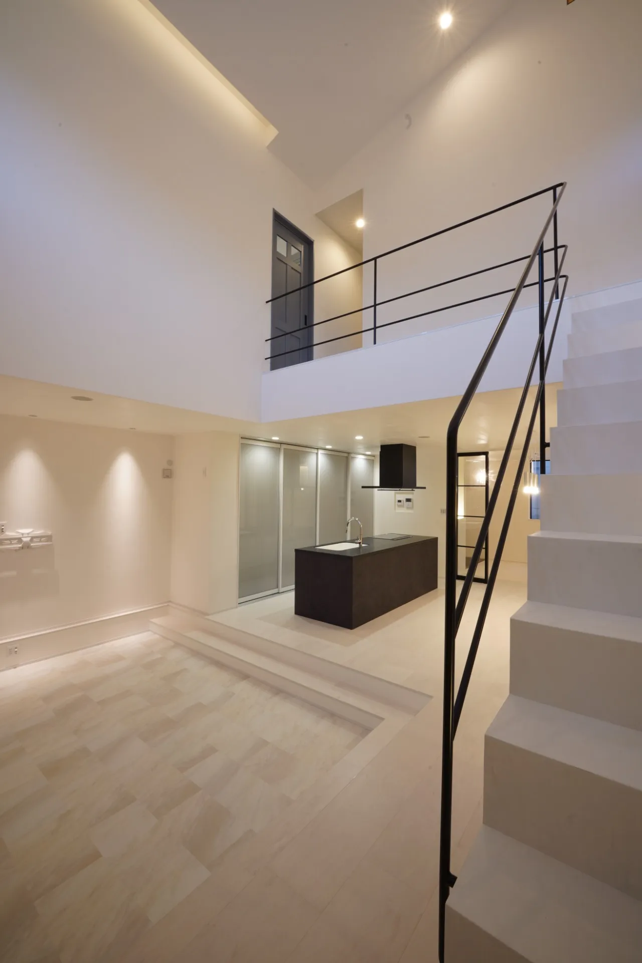 手すりのデザインが際立つインテリア。 白い空間に黒が引き立ちます。