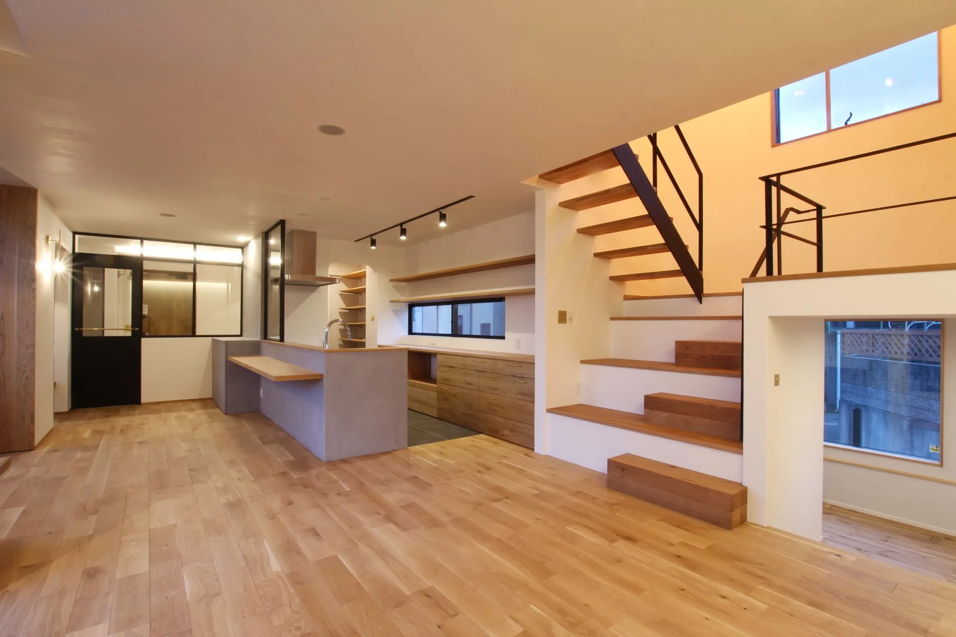 隣家を借景にした心地よい窓辺。スキップフロアのある家。