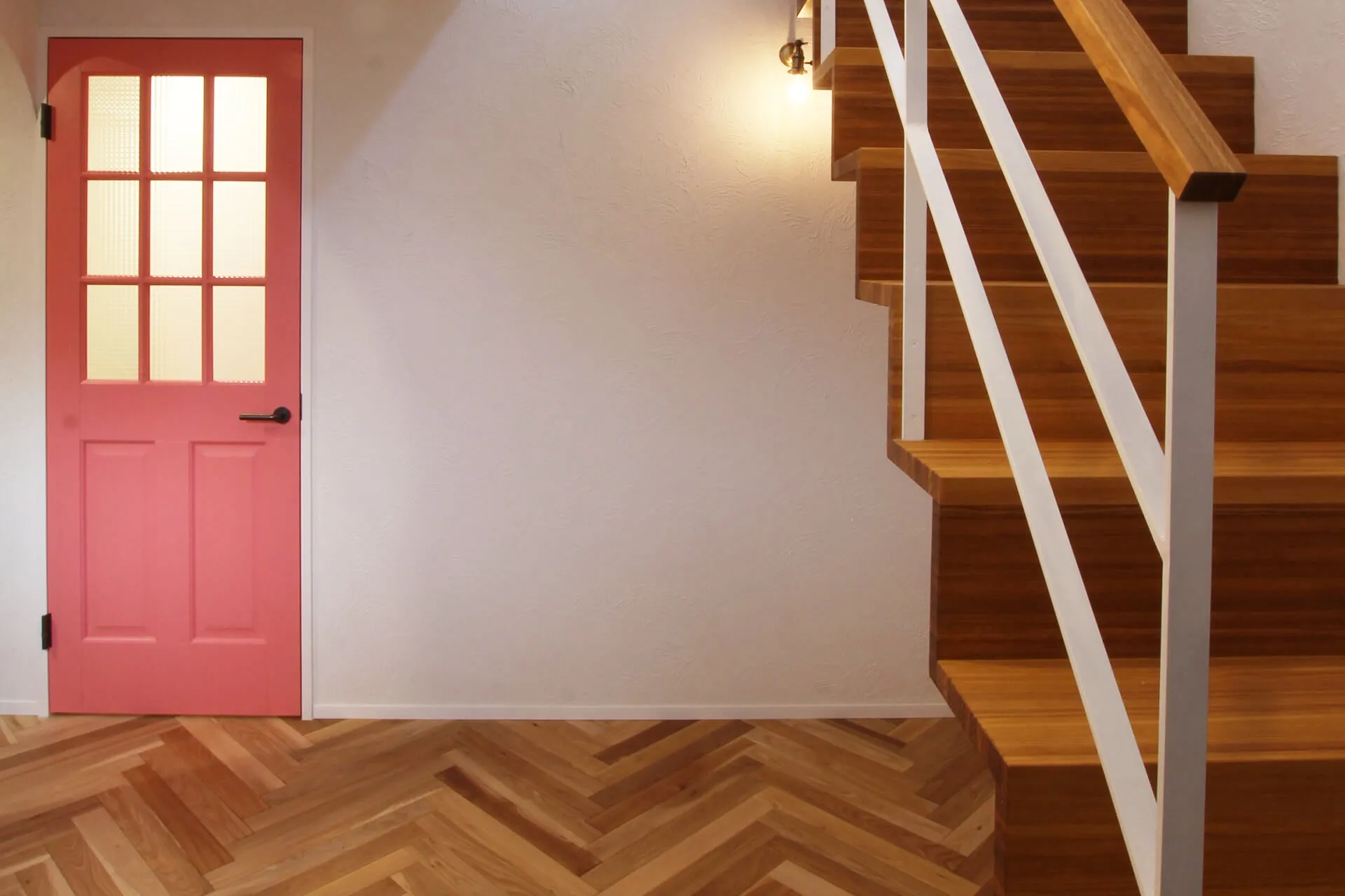 色彩鮮やかなドア、カラフルなクロスが迎えてくれるポップでカラフルな空間が特徴。玄関扉を開けると可愛いピンクのドアが目に留まり、右手にはニレをヘリンボーンで組んだ床のホールが広がる。階段を上がるとDIYされたアメリカンフェンスにブルーのドア。LDKのキッチン一体型のオリジナルダイニングテーブルは家族での食事に楽しさという調味料を加えてくれます。ガレージスペースが作れるからハナハウスを選びました、そんなご夫婦のこだわり尽くしのお家。