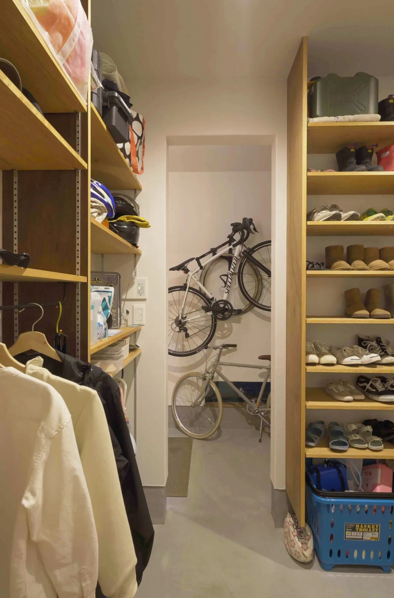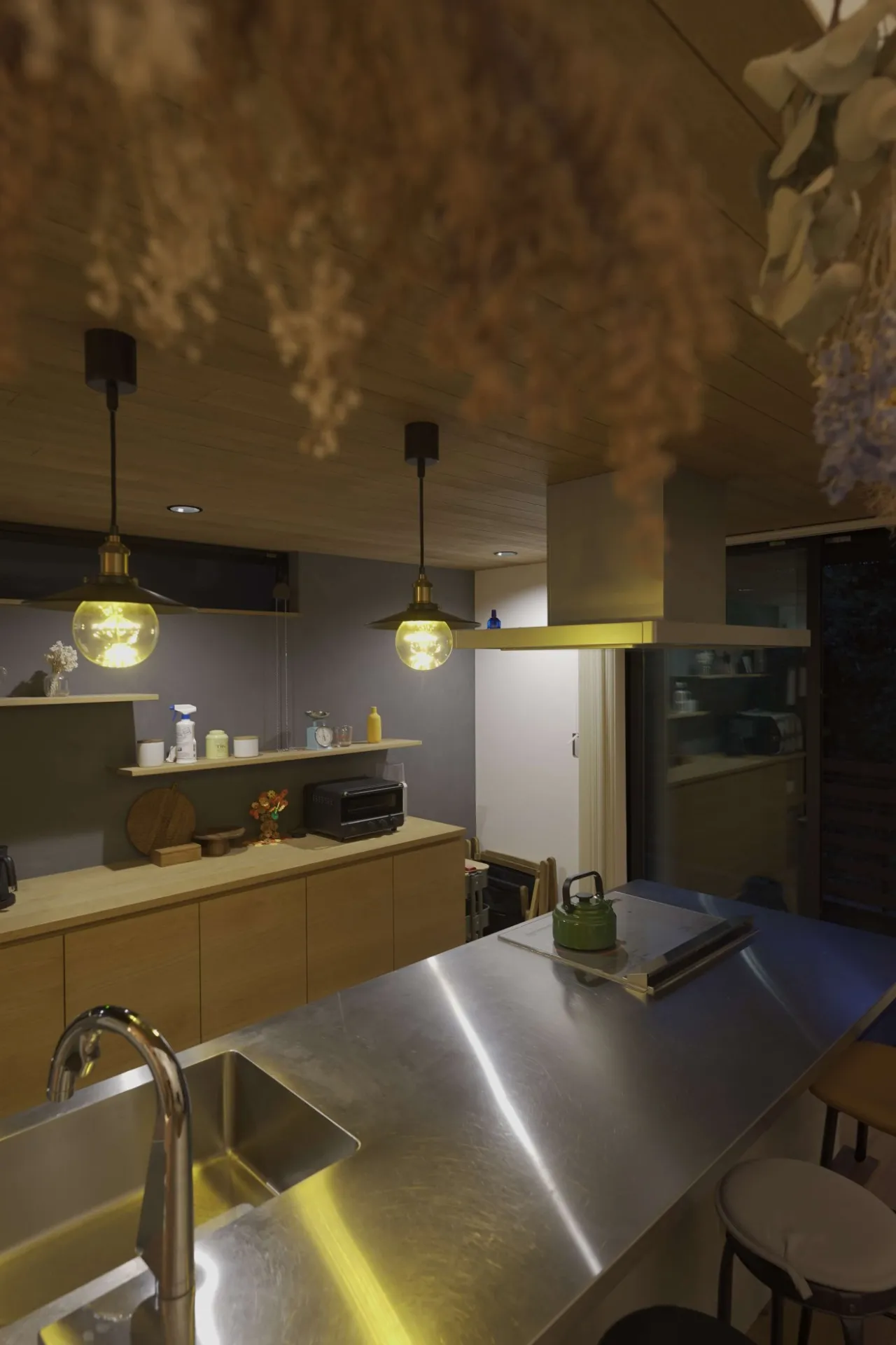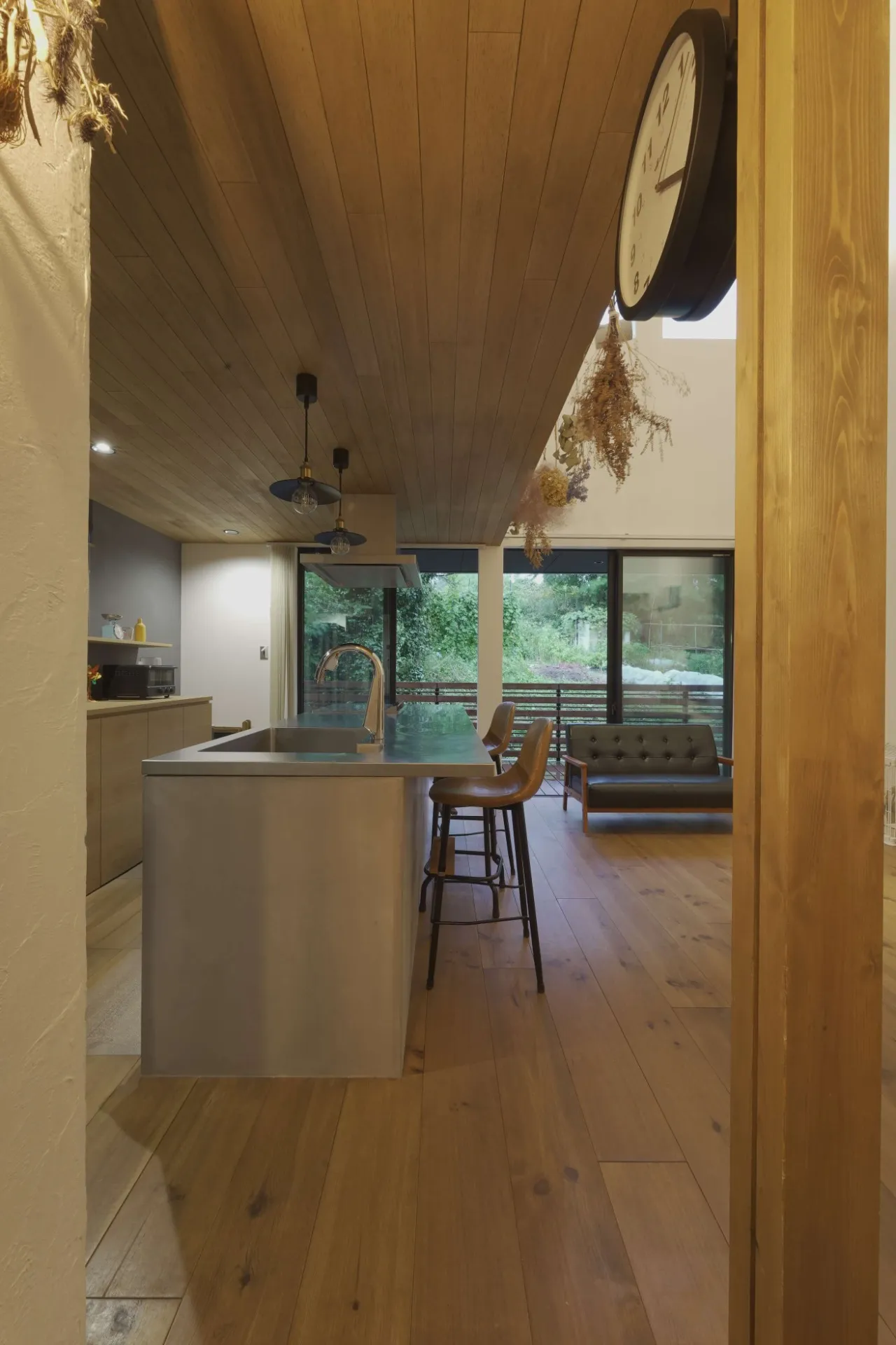 大きくデザインされた木製の引き戸を開けると、土間スペースとリビングがつながり、キッチンの階上にある2階の部屋がそのままつながっています。まるでミニチュアハウスを縦にパカッと開けたドールハウスの断面をそのまま原寸で建てたようなお家。2階のお部屋の大きなRの天井とリビングの吹抜けが勾配天井でつながった空間は、圧巻の抜けを感じられます。平面から高さ要素を考慮する空間の広がりによって心地よさが変わることを実感できます。インテリアは、パインのラフな無垢の床にモルタルグレーの質感が際立つナチュラル感を意識しました。