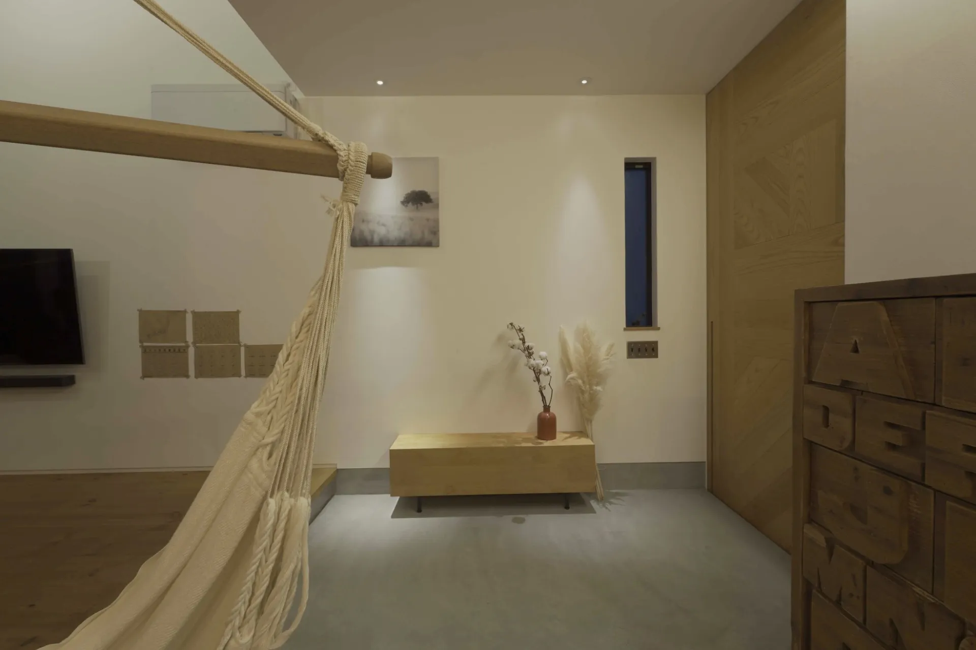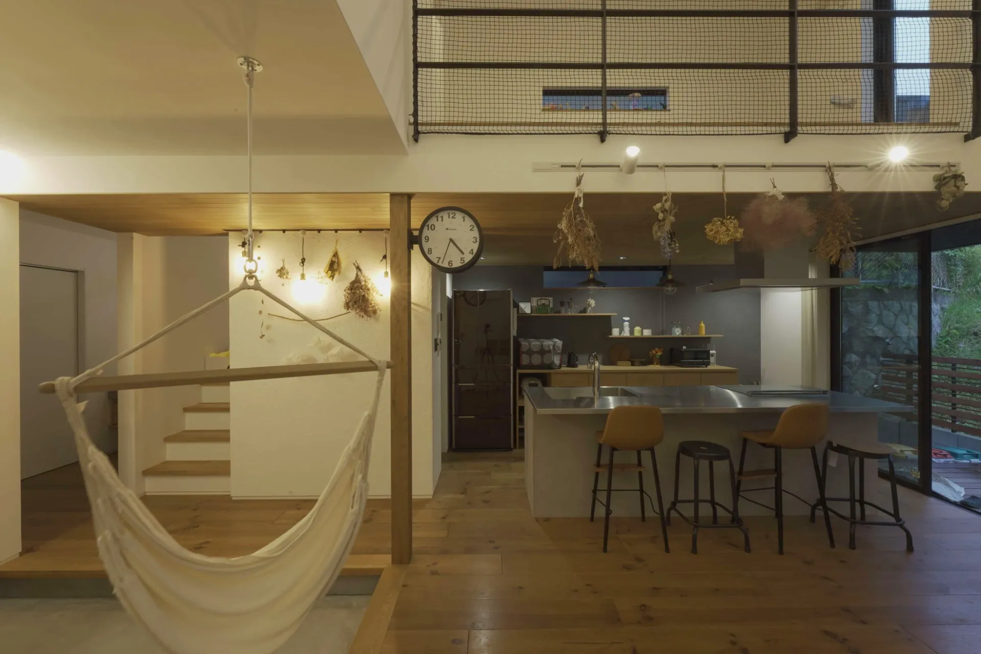 高天井の吹き抜けの先にベッドルームが。お施主様の遊び心溢れるお家。