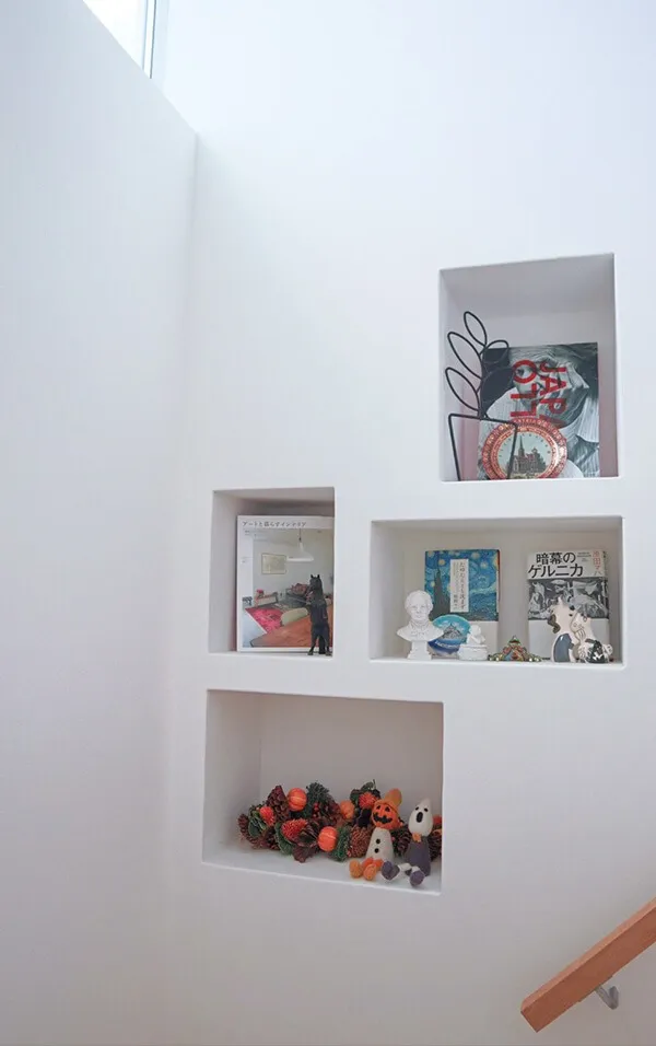 高台の住宅街に建つM様邸。立地を最大限活かした2階リビングの大きなL字窓からは、遠くまで生駒の山々が望めます。自然光をたくさん取り入れたLDKは、敢えて節や白太の混ざったナラのフロアをベースに、真っ白なメラミンキッチンや異形の壁面タイル、ホワイトのハイドアなど無機質な素材を合わせて、シンプルだけどどこか素朴な空間を目指しました。Mさんのセンスが光る、ニュアンスカラーの取り入れ方も必見です。